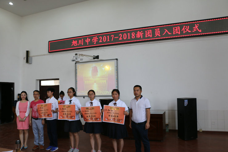 大会在庄严的国歌声中拉开帷幕。新团员入团仪式上,旭川中学领导为新团员亲手佩戴上团徽,入团介绍人代表周红宣读团员的义务和责任,新团员代表罗承耀和老团员姜蕴哲分别作了发言,校团委书记罗敏对新团员表示祝贺并提出了殷切的希望,政教主任王亮宣读了表彰决定。